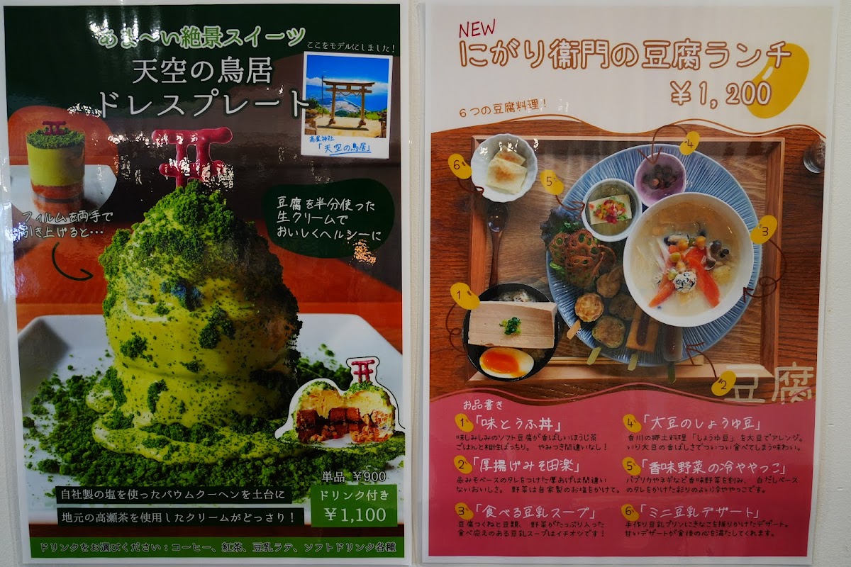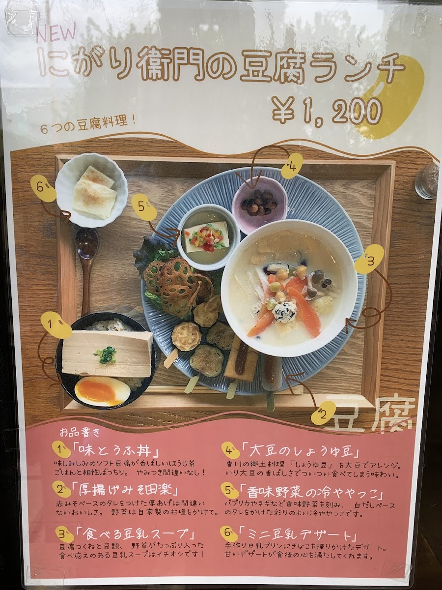 The lunch menu features enticing options like the Tofu Lunch Plate for JP¥1,200, which offers a delectable array of tofu delicacies. For a refreshing beverage, try the Nigariemon Blend Coffee (JP¥300), a smooth blend that highlights a rich yet subtle flavor profile.